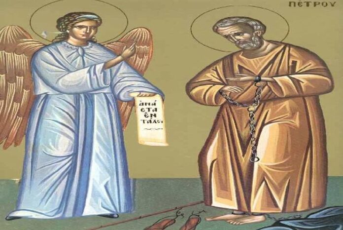 Ξαφνικά ήλθε Άγγελος Κυρίου και έλαμψε φως στο κελί. Αφού κτύπησε την πλευρά του Πέτρου, τον ξύπνησε και του είπε: «Σήκω γρήγορα». Και έπεσαν οι αλυσίδες από τα χέρια του. Κάποιοι Χριστιανοί ευσεβείς διαφύλαξαν αυτή την αλυσίδα διαδοχικά από γενεά σε γενεά, μέχρι που την μετέφεραν στην Κωνσταντινούπολη και την εναπέθεσαν στο ναό του Αγίου Πέτρου, που βρίσκεται μέσα στη μεγάλη Εκκλησία, όπου ετελείτο και η Σύναξη του Αποστόλου.