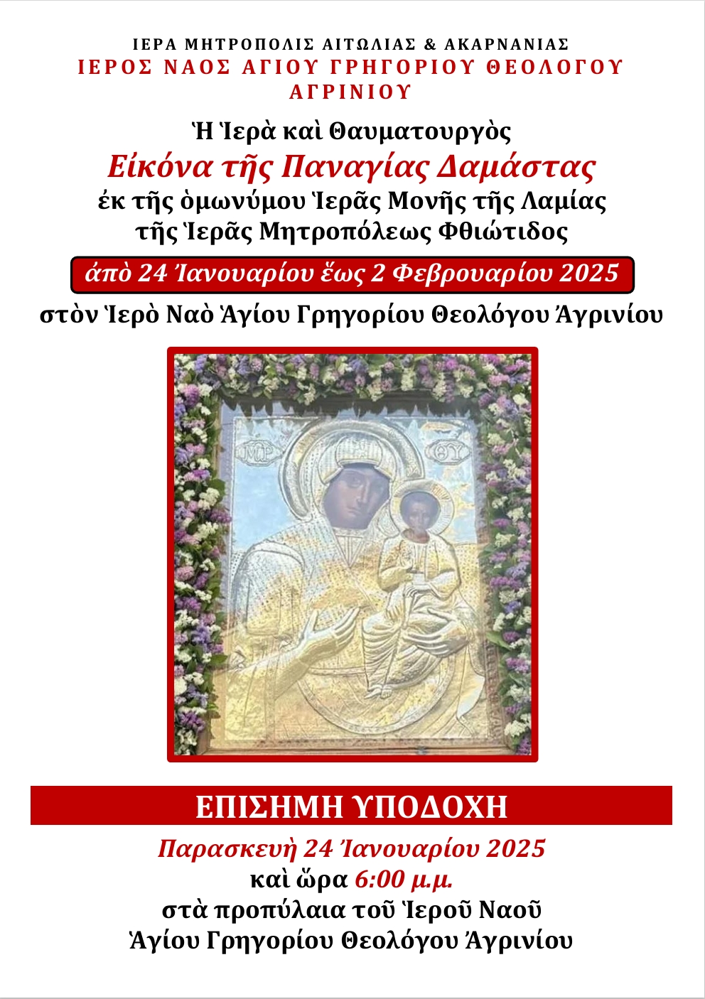 Την Παρασκευή 24 Ιανουαρίου 2025 και ώρα 6:00 το απόγευμα στα προπύλαια του Ιερού Ναού Αγίου Γρηγορίου Θεολόγου Αγρινίου θα πραγματοποιηθεί η επίσημη υποδοχή της Ιεράς και Θαυματουργού Εικόνος της Παναγίας Δαμάστας εκ της ομωνύμου Ιεράς Μονής της Λαμίας της Ιεράς Μητροπόλεως Φθιώτιδος από τον Σεβασμιώτατο Μητροπολίτη Αιτωλίας και Ακαρνανίας κ. κ. Δαμασκηνό, τον Ιερό Κλήρο και τις Αρχές της πόλεως.