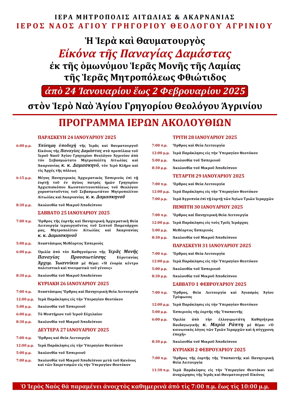 Η Ιερά και Θαυματουργός Εικόνα της Παναγίας Δαμάστας θα παραμείνει στον Ιερό Ναό έως την Κυριακή 2 Φεβρουαρίου 2025, όπου καθημερινά θα τελούνται Ιερές Ακολουθίες κατά το ακόλουθο πρόγραμμα. Ο Ιερός Ναός θα παραμένει ανοιχτός από τις 7:00 π.μ. έως τις 10:00 μ.μ.