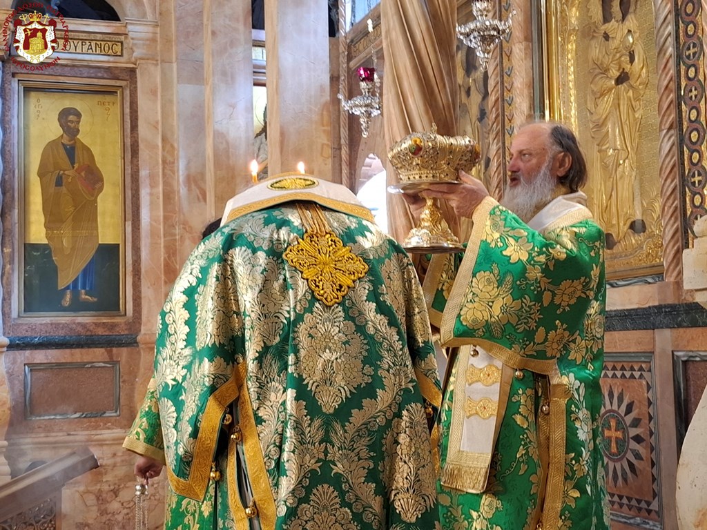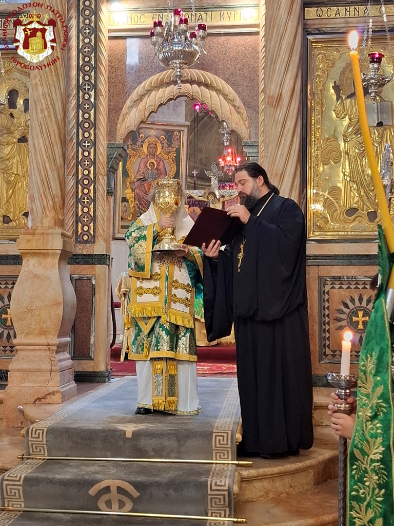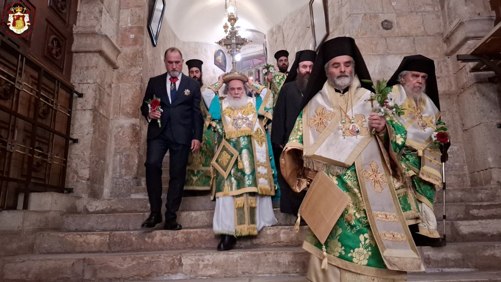 Τέλος, η πομπή κατέβηκε από τα σκαλοπάτια του Γολγοθά στο Ιερό Βήμα του Καθολικού και ακολούθησε η άνοδος στα Πατριαρχεία, όπου ο Μακαριώτατος απηύθυνε προσφώνηση στην ελληνική γλώσσα.