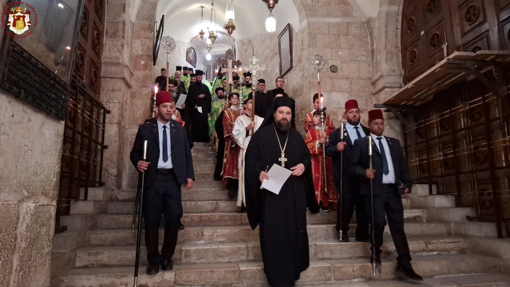 Μετά την Απόλυση της Θείας Λειτουργίας ξεκίνησε λιτανεία από το Καθολικό. Η πομπή κινήθηκε αριστερά, πέρασε από την Αγία Αποκαθήλωση και κατέβηκε στο παρεκκλήσιο της Αγίας Ελένης, που χρησιμοποιείται από τους Αρμενίους.