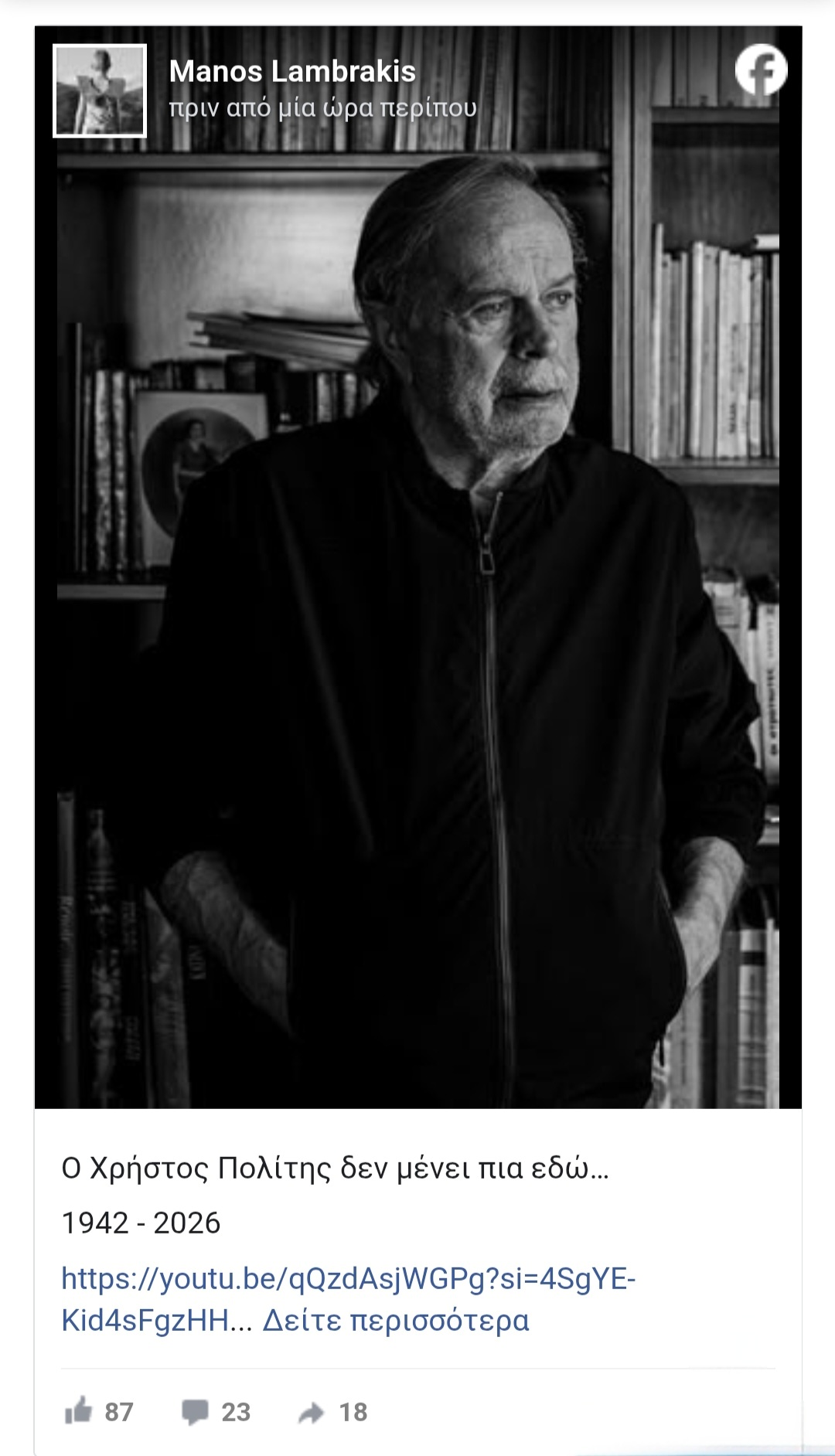 «Ο Χρήστος Πολίτης δεν μένει πια εδώ… 1942 – 2026» έγραψε ο κ. Λαμπράκης.
