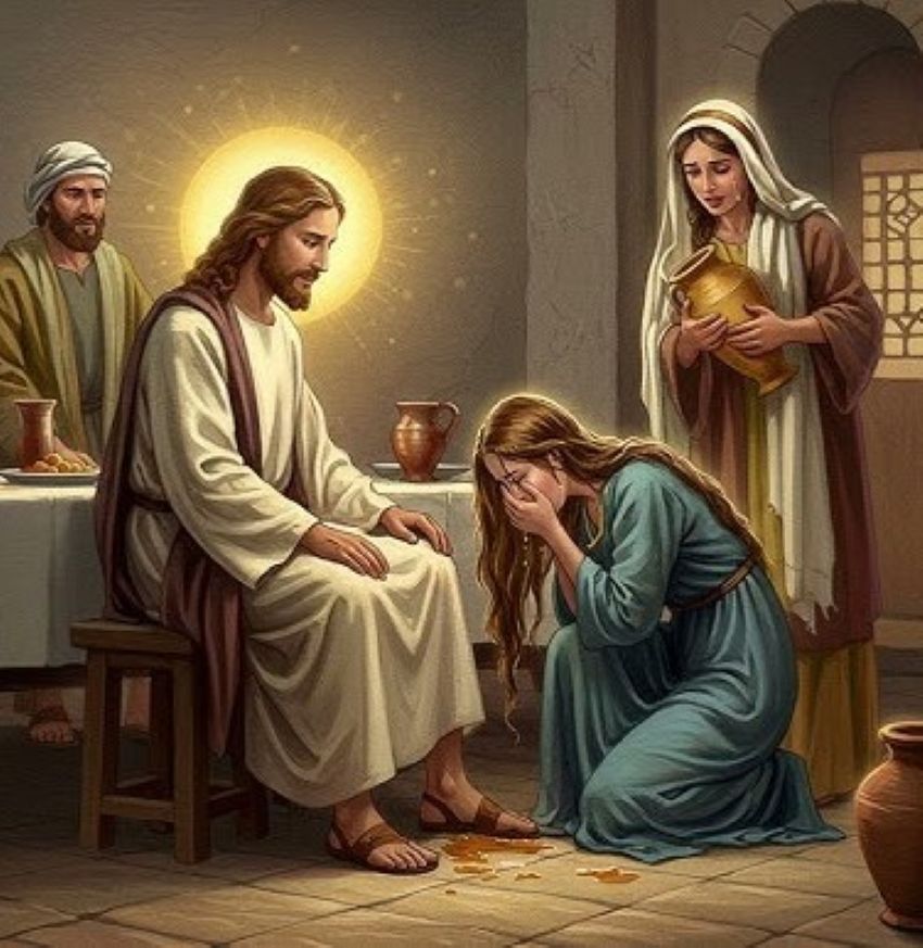 Η γυναίκα άνοιξε το δοχείο και άρχισε να ρίχνει μύρο και να πλένει τα πόδια του Ιησού, ενώ ταυτόχρονα έπεφταν τα δάκρυα της, που έτρεχαν σαν ποτάμι από τα μάτια της. Αφού άδειασε το δοχείο ξέπλεξε τα μαλλιά της και σκούπισε με αυτά τα πόδια του Ιησού, ενώ τα φιλούσε αδιάκοπα.