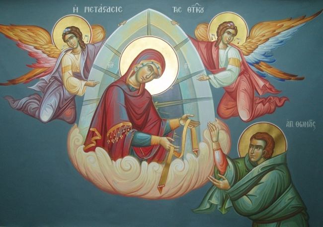 Ο Θωμάς έδειξε τη Ζωνη στους υπόλοιπους μαθητές που όταν τους διηγήθηκε την ιστορία άνοιξαν το μνήμα όπου είχαν εναποθέσει το Σώμα της Παναγίας και είδαν ότι έλειπε.