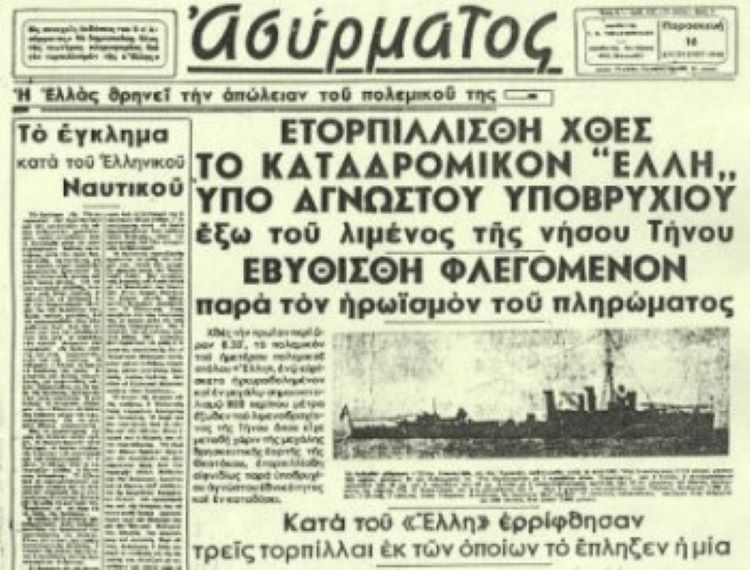 Ανήμερα της εορτής της Παναγίας το 1940, το ιταλικό υποβρύχιο «Ντελφίνο» τορπιλίζει και βυθίζει στο λιμάνι της Τήνου το ελληνικό καταδρομικό «Έλλη».