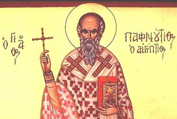 Ο Άγιος Παφνούτιος έζησε στα χρόνια του αυτοκράτορα Διοκλητιανού (284-305 μ.Χ.). Όταν αυτός κήρυξε διωγμό κατά των χριστιανών, ο έπαρχος Αρριανός ξεκίνησε να συλλάβει τον Παφνούτιο μέσα στίς ερημιές της Αιγύπτου, όπου ζούσε. Αλλά αυτός έρχεται και συναντά μόνος του τον Αρριανό, που διέταξε να βασανισθεί ο Παφνούτιος επί τόπου. Ξέσχισαν τις σάρκες του μέχρι του σημείου να φαίνονται τα εντόσθια του.